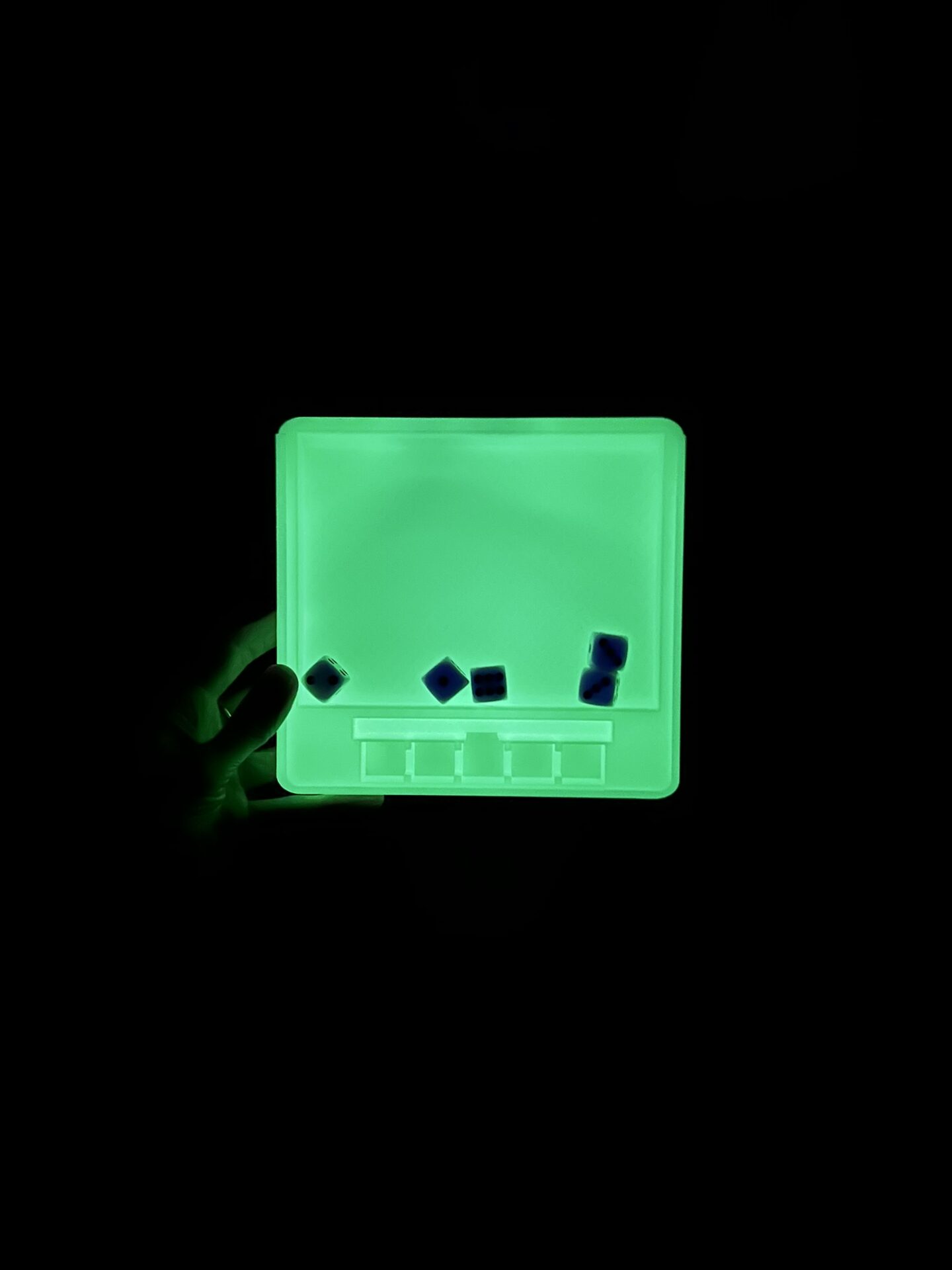 Plateau de jeu imprimé en 3D qui brille dans le noir. Le yams ou yahtzee est un jeu de dés canadien créé en 1954 et fondé sur le hasard raisonné.
